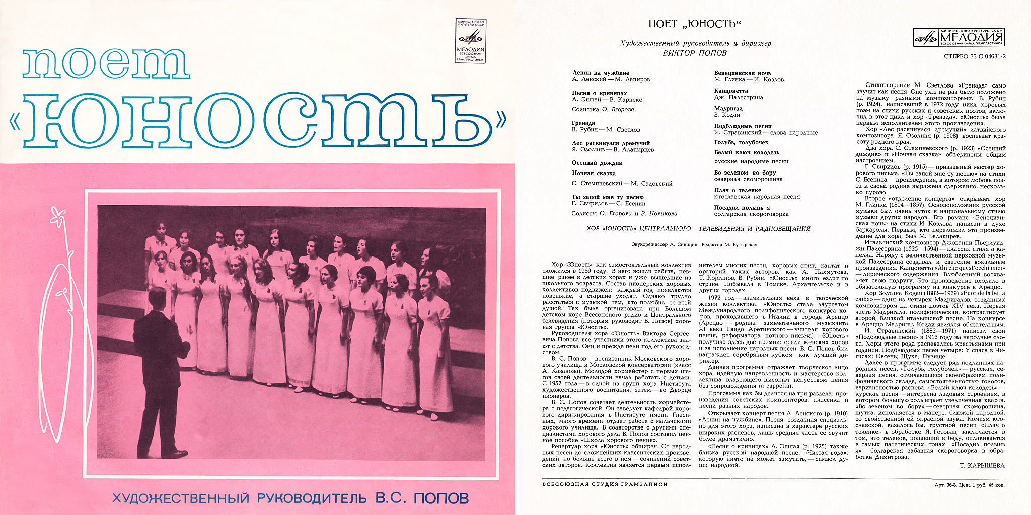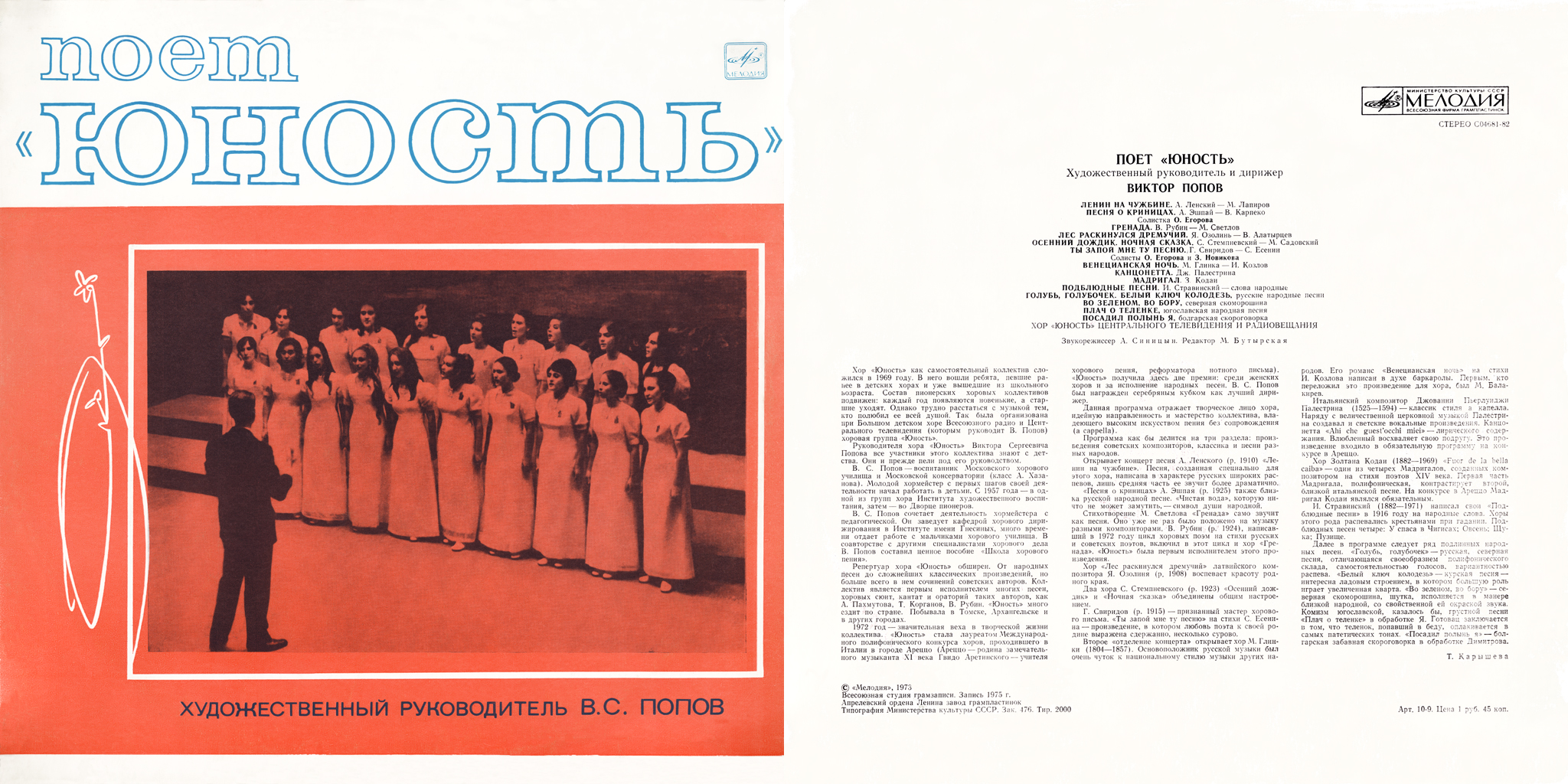 Хор «Юность» как самостоятельный коллектив сложился в 1969 году. В него вошли ребята, певшие ранее в детских хорах и уже вышедшие из школьного возраста. Состав пионерских хоровых коллективов подвижен: каждый год появляются новенькие, а старшие уходят. Однако трудно расстаться с музыкой тем, кто полюбил ее всей душой. Так была организована при Большом детском хоре Всесоюзного радио и Центрального телевидения (которым руководит В. Попов) хоровая группа «Юность».