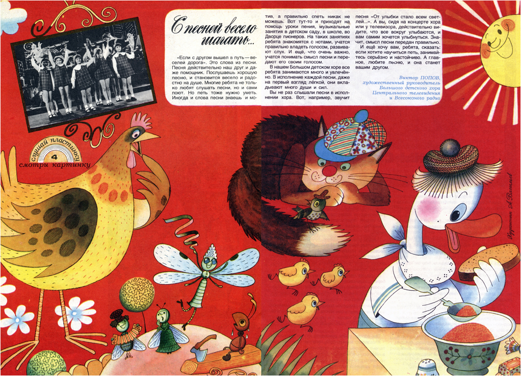 На страницах журнала, посвященных этой стороне пластинки, есть заметка Виктора Попова о хоре, в которой хор указан как «Большой детский хор Центрального телевидения и Всесоюзного радио, художественный руководитель Виктор ПОПОВ».
