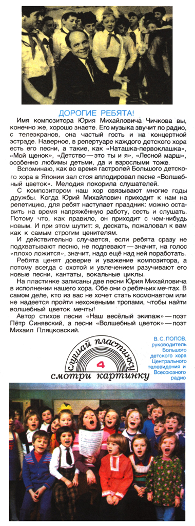 На пластинке записаны две песни Юрия Михайловича в исполнении нашего хора. Обе они о ребячьих мечтах. В самом деле, кто из вас не хочет стать космонавтом или не надеется пройти нехожеными тропами, чтобы найти волшебный цветок мечты!
