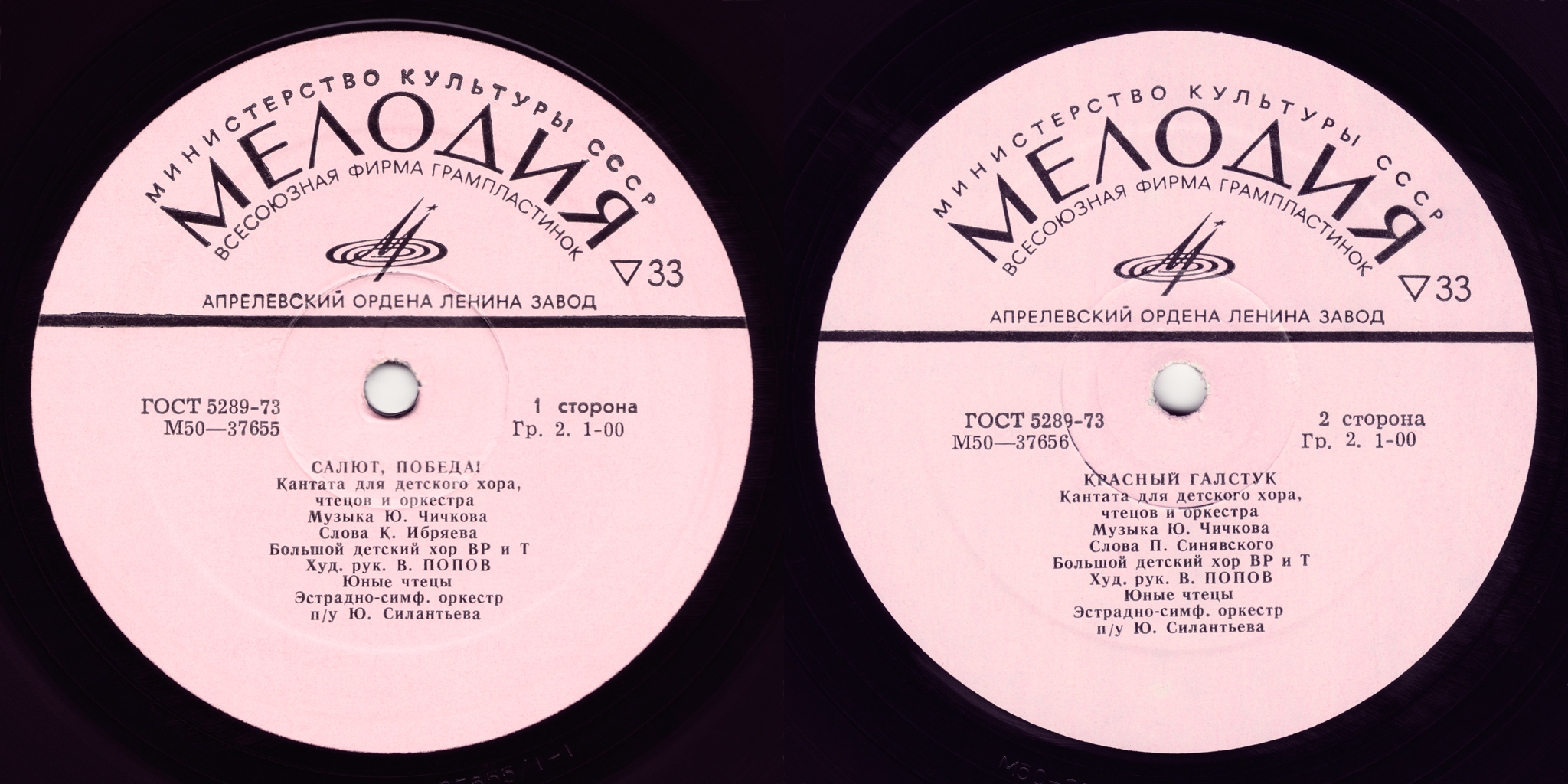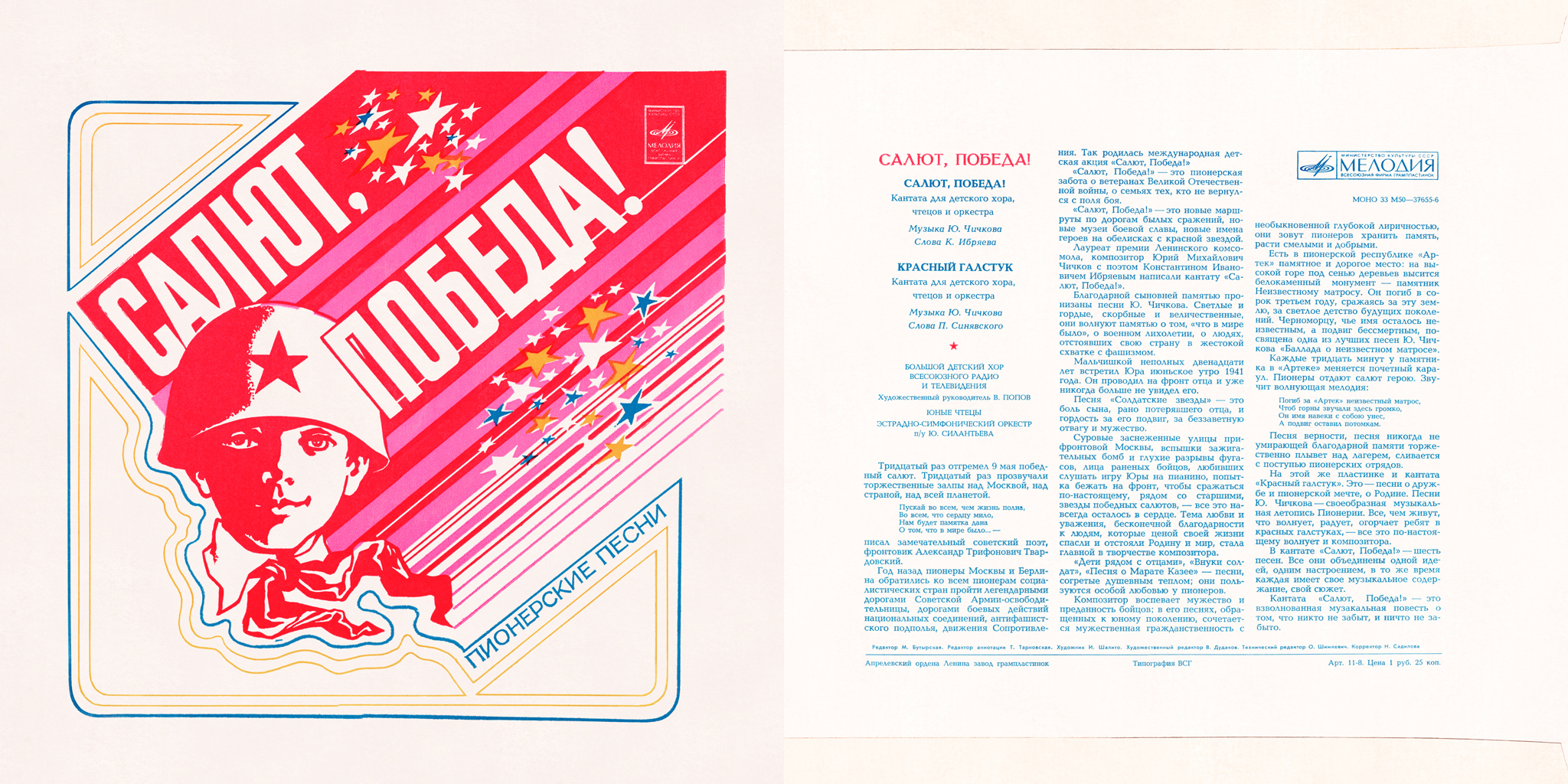 Дополнительная информация: Пластинка была выпущена специально для участников Международного детского фестиваля «Салют, Победа!», посвященного 30-летию Победы советского народа в Великой отечественной войне, который прошел в «Артеке» с 4 по 7 августа 1975 года. За год до этого пионеры Москвы и Берлина обратились ко всем пионерам социалистических стран «пройти легендарными дорогами воинов-освободителей от фашизма». Так родилась международная детская акция «Салют, Победа!». И вот делегаты 65 детских и юношеских организаций собрались в «Артеке», чтобы подвести итоги своей работы. На торжественном открытии фестиваля состоялся парад участников, были вынесены боевые знамена воинских частей. От факела, зажженного от вечного огня на могиле Неизвестного солдата в Москве, вспыхнул Огонь Славы у могилы Неизвестного матроса в «Артеке». В красочном празднике приняли участие диктор радио Юрий Левитан, Мелитон Кантария, водрузивший Знамя Победы над Рейхстагом, поэт Сергей Михалков, летчик-космонавт Павел Попович и многие другие почетные гости. Большой праздник на стадионе завершился концертом, в котором приняли участие сводный хор пионеров социалистических стран, творческие коллективы из разных республик Советского Союза и гости фестиваля. В последующие дни в лагерях «Артека» прошли концерты лауреатов конкурсов национальной песни, музыки, танца, а также встречи с Героями Советского Союза и Народными героями других стран. Все дни у Огня Славы сменялся пионерский почетный караул. В последний день фестиваля состоялся грандиозный митинг «Дети разных народов, мы мечтою о мире живем», на котором более четырех тысяч участников фестиваля исполнили песню композитора Юрия Чичкова на стихи Константина Ибряева «Салют, Победа!», специально написанную для этого праздника. Также каждый участник этой артековской смены получил в подарок грампластинку с кантатами Юрия Чичкова «Салют, Победа!» и «Красный галстук» в исполнении Большого Детского хора Центрального телевидения и Всесоюзного радио. Пластинку, по всей видимости, готовили в большой спешке, так как аннотация к ней вызывает недоумение. Скорее всего, автор писала текст, не зная содержимого программы. Так, например, в аннотации указано, что в кантате «Салют, Победа!» шесть песен, хотя на самом деле их семь. Перечисляются песни, написанные Юрием Чичковым, но ни одна из них в кантату не входит. Кроме того, автором слов всех песен кантаты «Красный галстук» указан Петр Синявский, в то время как слова для «Торжественного обещания» написал Константин Ибряев, а для «Веселой эстафеты» Яков Халецкий.