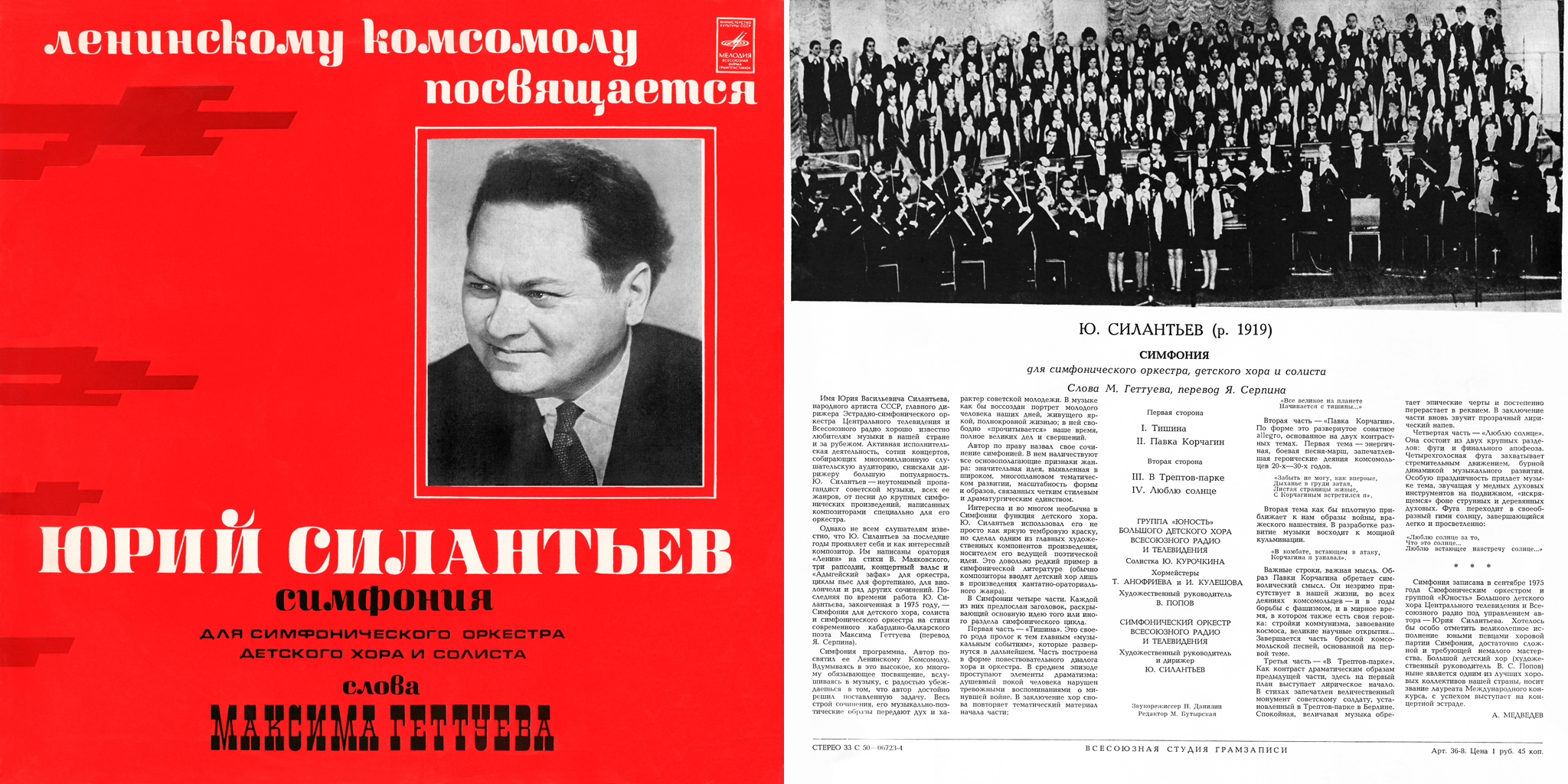 Однако не всем слушателям известно, что Ю. Силантьев за последние годы проявляет себя и как интересный композитор. Им написаны оратория «Ленин» на стихи В. Маяковского, три рапсодии, концертный вальс и «Адыгейский зафак» для оркестра, циклы пьес для фортепиано, для виолончели и ряд других сочинений. Последняя по времени работа Ю. Силантьева, законченная в 1975 году, — Симфония для детского хора, солиста и симфонического оркестра на стихи современного кабардино-балкарского поэта Максима Геттуева (перевод Я. Серпина).